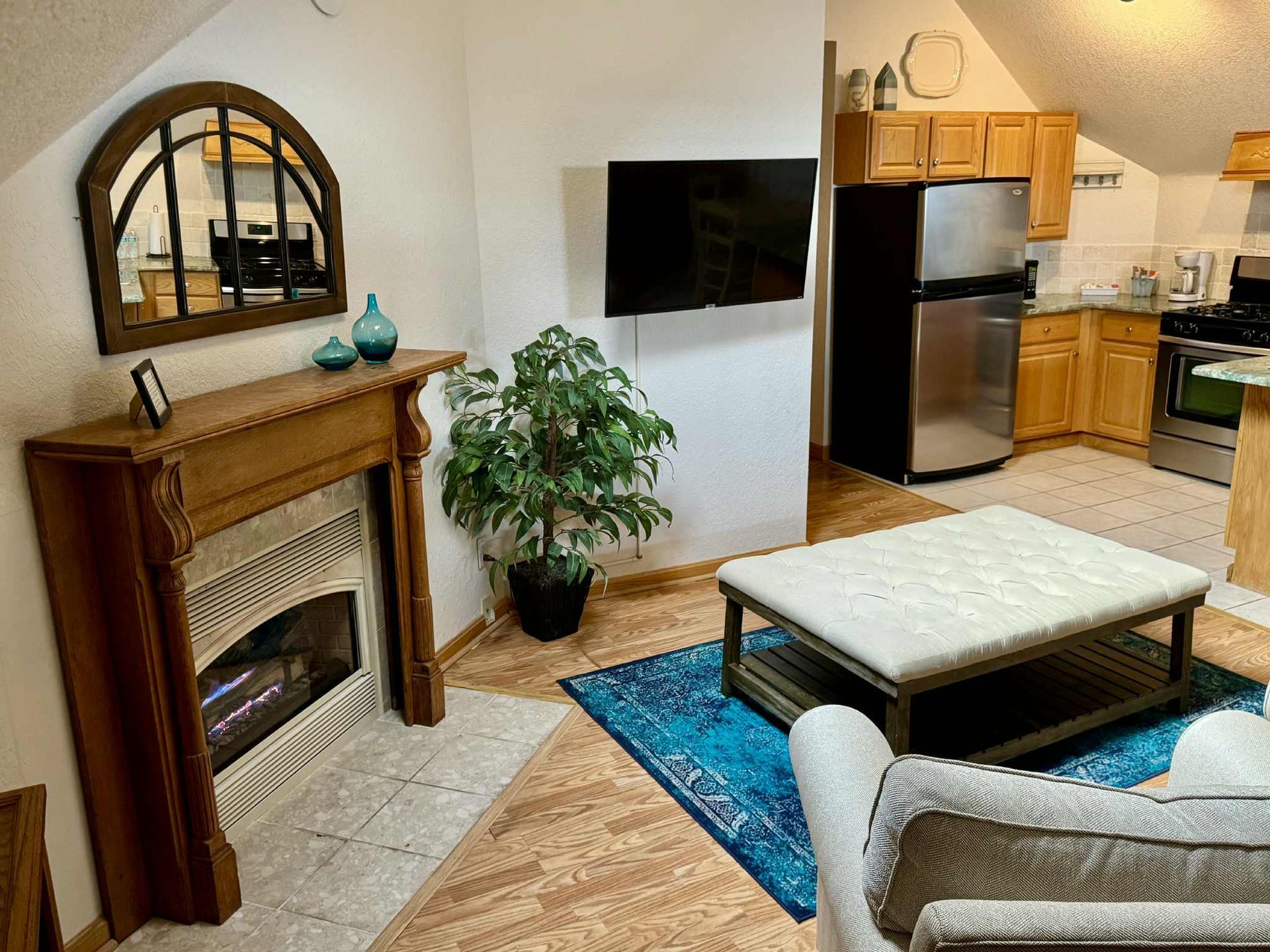 The Johnson's Island suite offers ample space for couples and families alike. Neutral tones in the kitchen and living room are accented perfectly by comfortable furnishings and an inviting fireplace. New in 2020 is a queen size sleeper couch with matching chair.